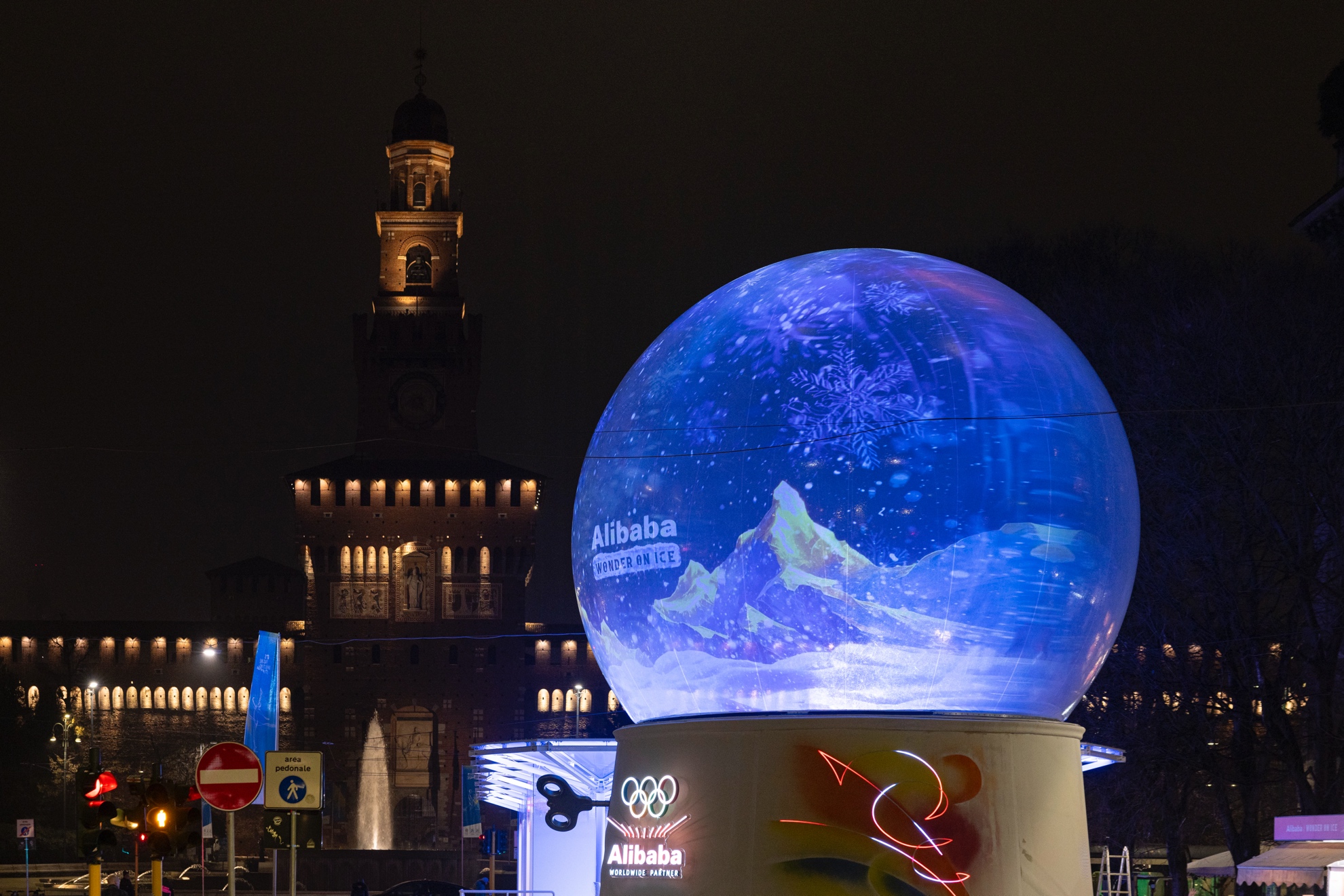 "米兰·阿里廊"是阿里巴巴在米兰斯福尔扎古堡前广场设置的体验馆,于米兰冬奥会和残奥会期间对游客开放。展馆由一颗直径8.8米的透明水晶球和一座总长约30米的冰晶穹顶组成。水晶球白天作为互动空间,夜间变身为AI生成视觉内容的投影表面。