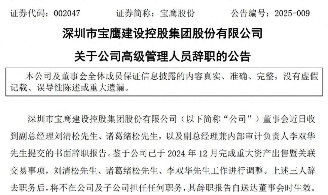 奥一新闻注意到,自今年开年以来,深圳市宝鹰建设控股集团股份有限公司(以下简称宝鹰股份)高管变动频繁。据宝鹰股份此前公告,在2025年3月至8月的半年间,多位高级管理人员提出辞职。