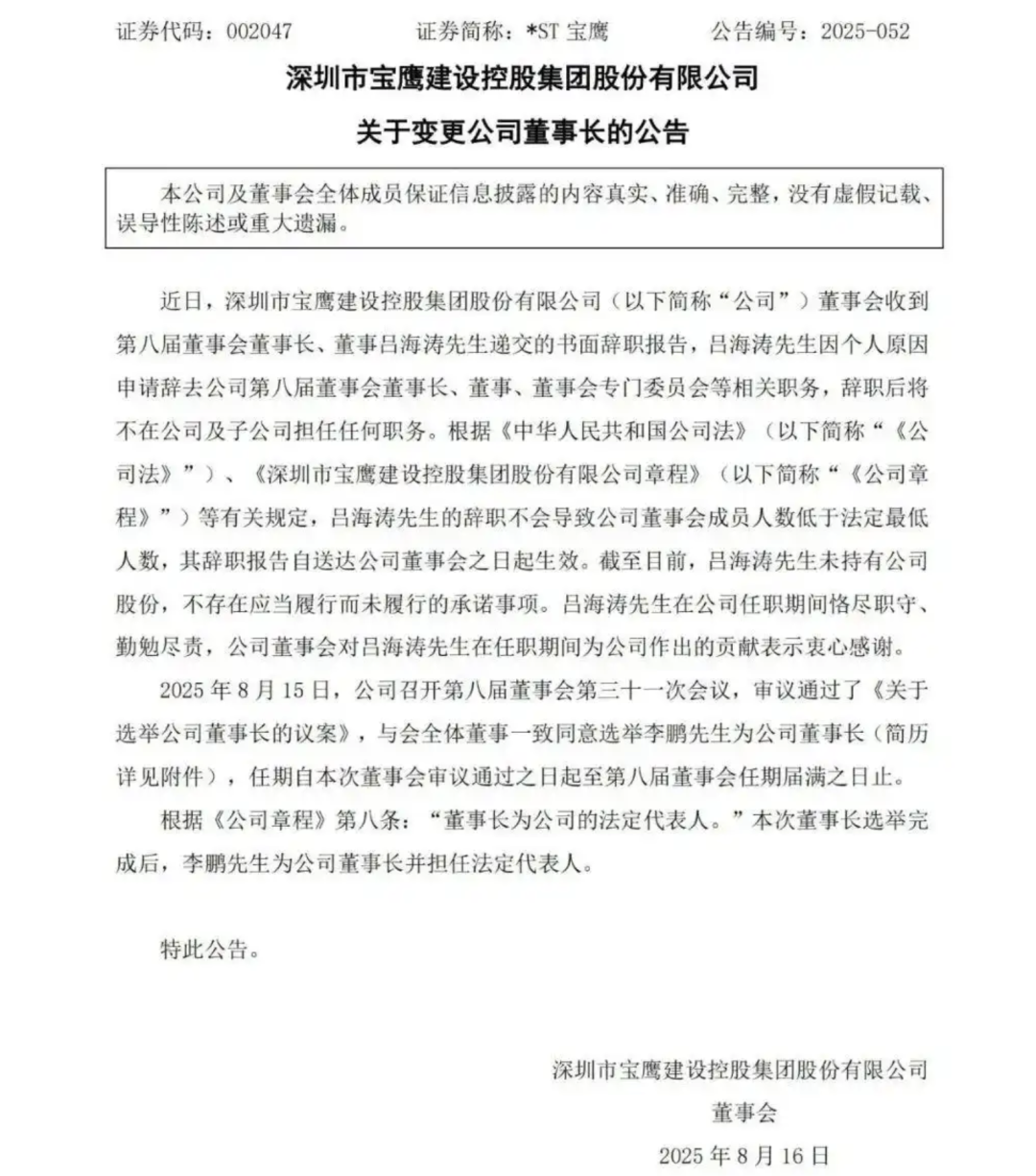 公告中提到,公司第八届董事会第三十一次会议作出决议,选举李鹏为公司新任董事长。其任期自本次董事会审议通过之日起,至本届董事会任期届满为止。根据公司章程规定,董事长同时为公司的法定代表人,因此李鹏即日起正式成为宝鹰建设的董事长及法定代表人。